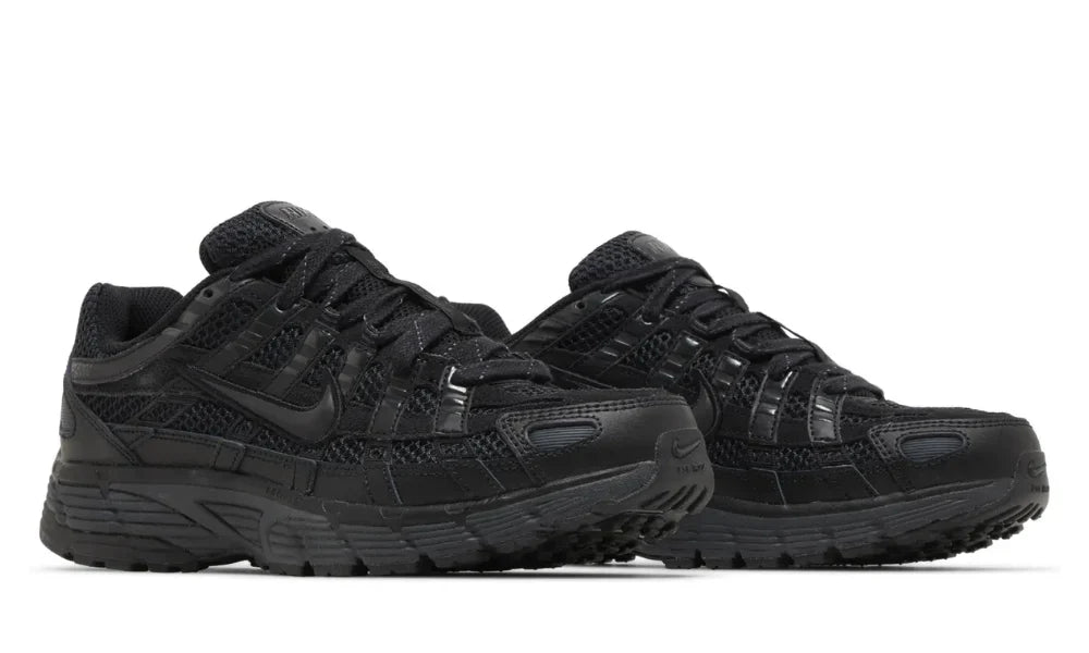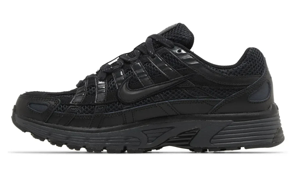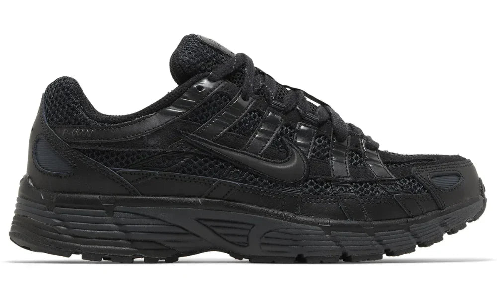 The Nike P-6000 Premium 'Triple Black' presents a blacked-out upper with ventilated mesh, leather overlays and a molded Swoosh outlined in embroidered detailing. Additional branding elements include a leather Nike tongue tag and 'P-6000' embossed on the lateral collar. A matching black Phylon midsole provides lightweight cushioning with each step.