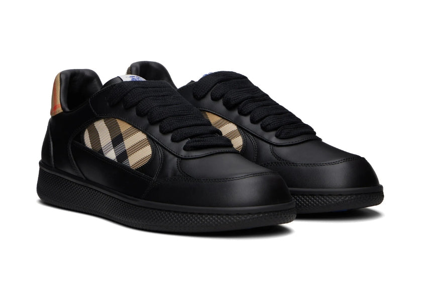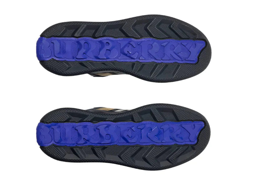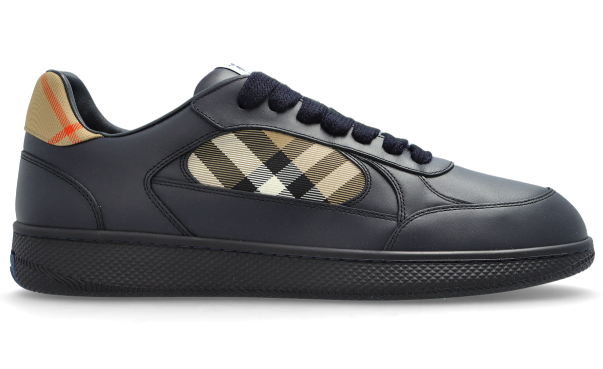 Italian-made sneakers in smooth calf leather, with a contrasting cuff and side panel woven with the Burberry Check in our signature sand colourway. The style features an Equestrian Knight Design label and the soles are moulded with archive Burberry lettering.