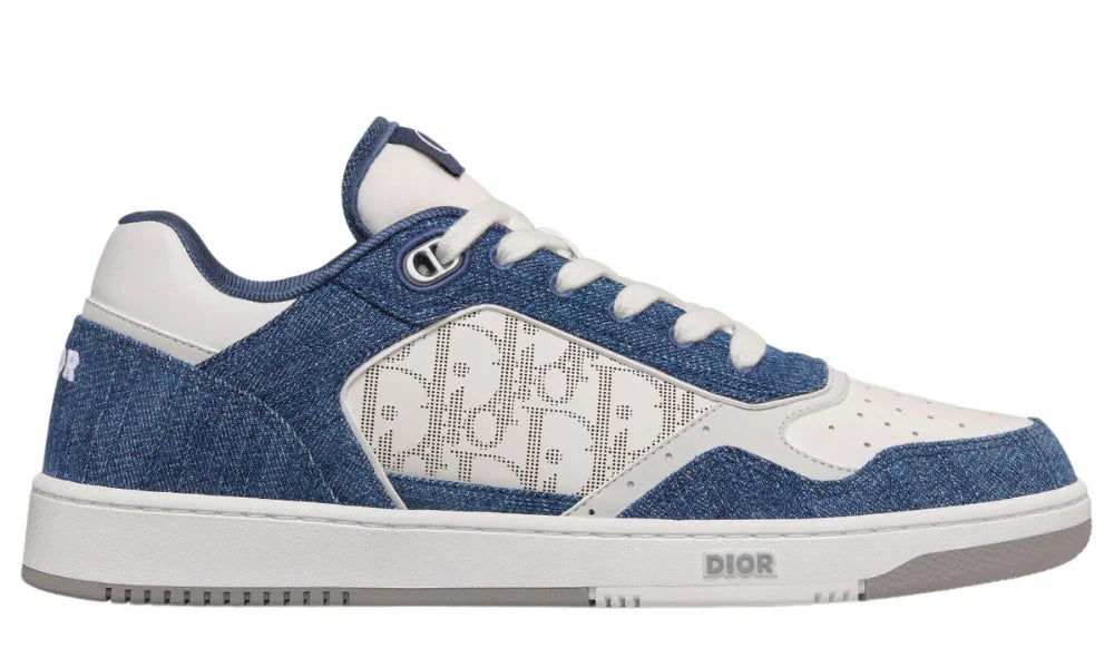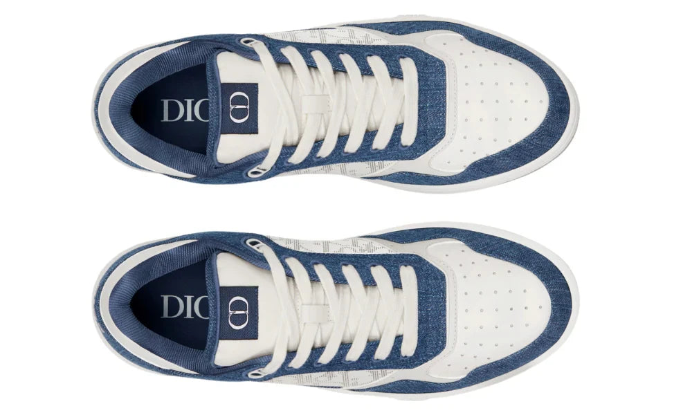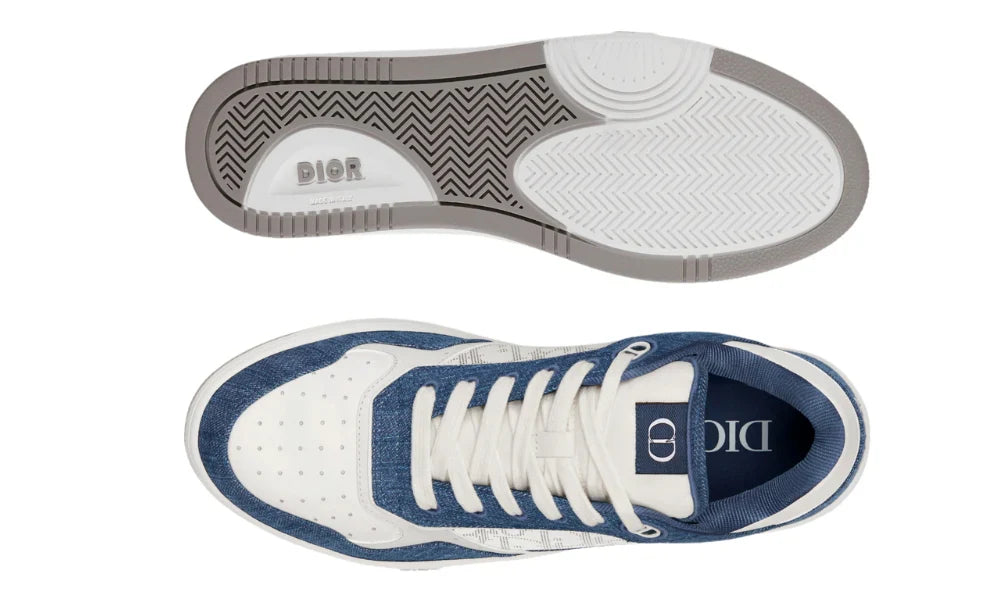 The B27 low-top sneaker is already a House essential. Crafted in white smooth calfskin and blue denim, the style is adorned with white Dior Oblique Galaxy leather inserts on the sides. The sneaker is enhanced with CD Icon eyelets as well as various hallmark details on the two-tone rubber sole, tongue and rear. The low-top sneaker will enhance any favorite outfit.